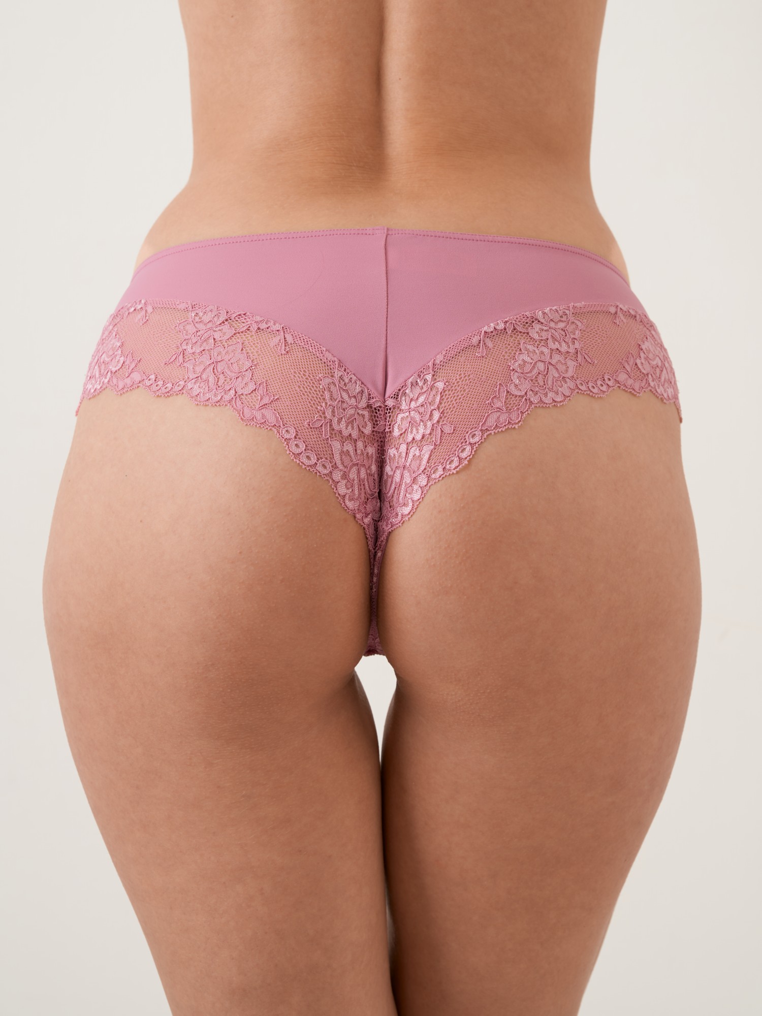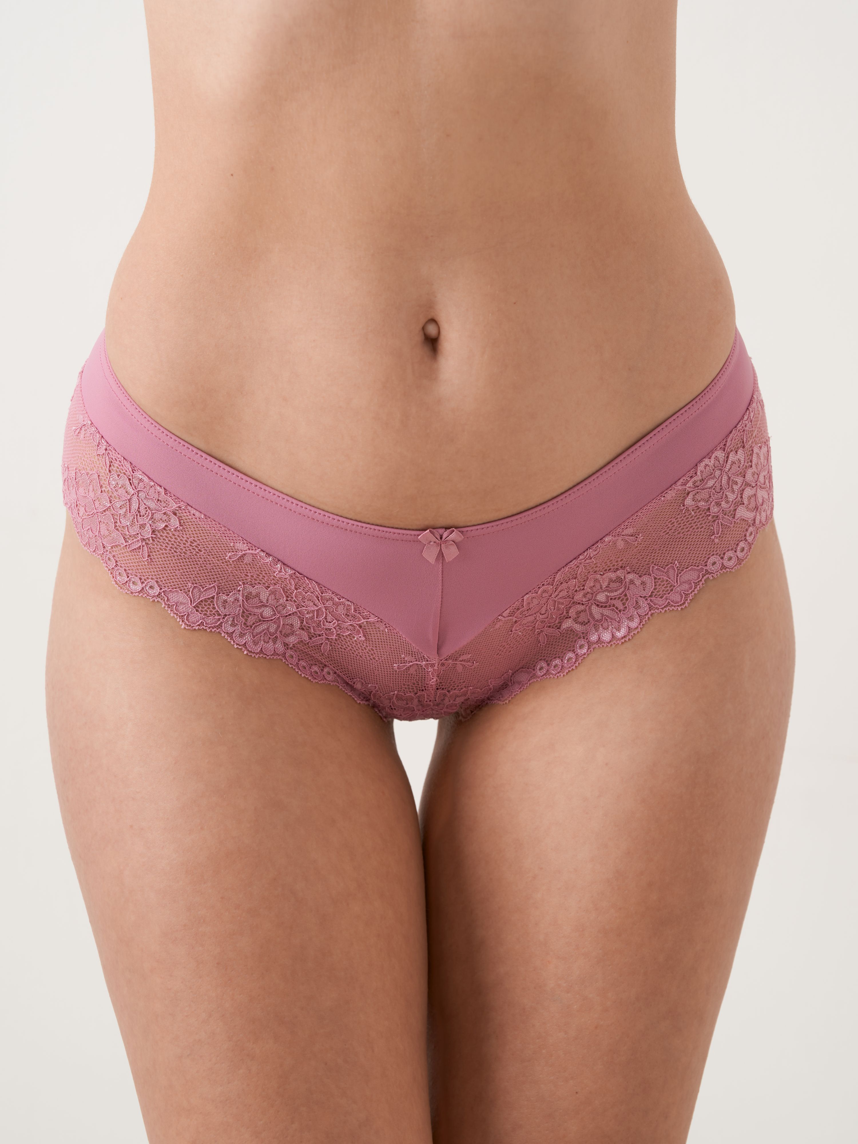 Elegantní kalhotky z jemného mikrovlákna doplněné o krajku na přední i zadní části. Přední díl má hladký střed a krajkové lemování nohaviček, které působí velmi ženským dojmem. Zadní část krásně zvýrazní linii boků. Materiál je příjemný na dotek, pružný a dokonale se přizpůsobí postavě. * Materiál: jemné mikrovlákno a elastická krajka * Přední část: hladký střed, krajka na nohavičkách * Zadní část: jemné mikrovlákno a elastická krajka * Střih: brazilky – elegantní a pohodlný * Vhodné pro každodenní nošení i romantické chvíle
