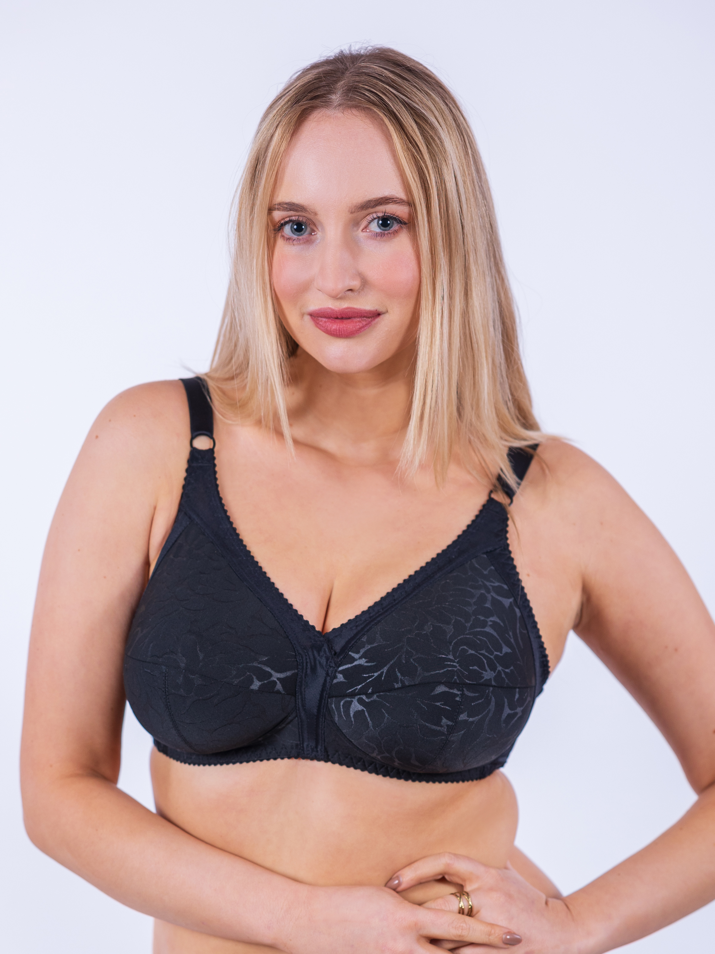 Klasická podprsenka z trendy žakárového materiálu s boční kosticí. Košíčky jsou pro větší pohodlí podložené elastickým tylem. Boční dílky jsou z pevnějšího materiálu, který krásně přilne na tělo. Ramínka se s většími velikostmi rozšiřují. Zapínání na 3 posuvné polohy - u menších velikostí ve 2 řadách, u větších ve 3 řadách.