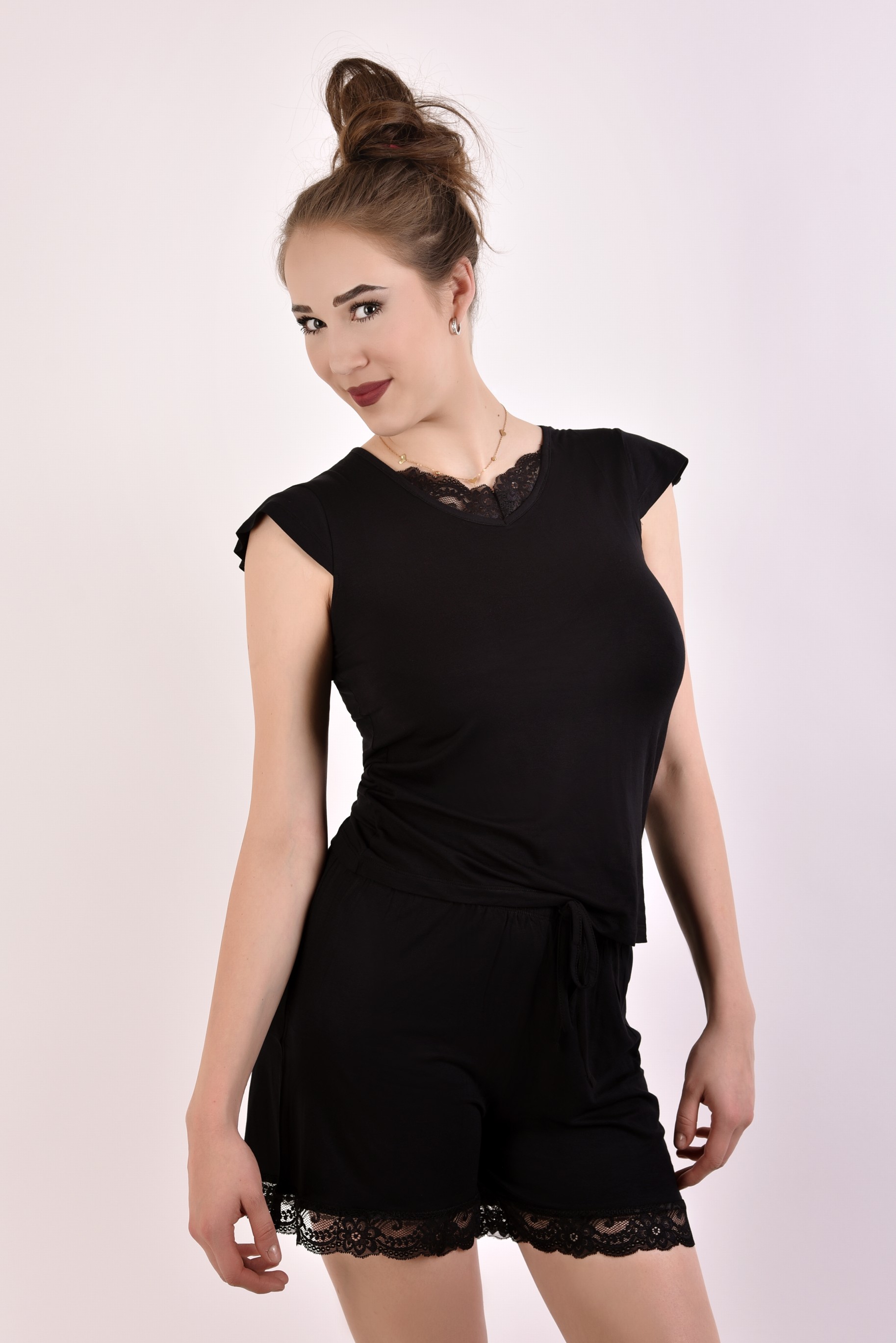 Popis:Dámské pyžamo Adele z měkké viskózy v černé barvě. Horní díl má krátký spadlý rukávek a výstřih do „V“ s jemnou krajkou, která nechá vyniknout dekolt, ale pořád působí decentně. Kraťasy mají pružný pas na šňůrku a spodní lem ozdobený krajkou, takže komplet působí žensky a lehce. Viskózový úplet je měkký, prodyšný a příjemný na celonoční nošení i domácí relax.