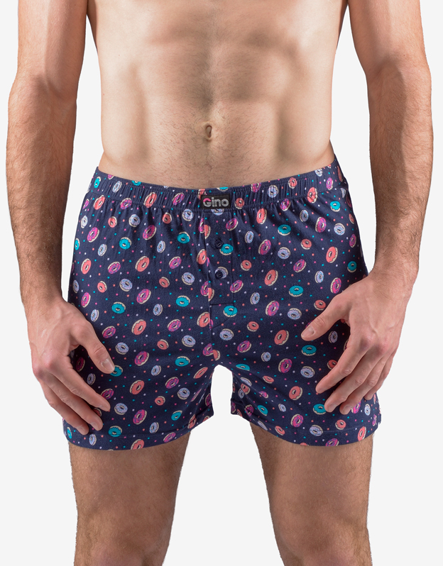 Volné trenky, pánské šité prádlo. V pasovém kraji je zašitá širší pruženka. Nohavičky jsou začištěné podehnutím. Na předním díle je vypracovaný rozparek na 2 knoflíky. Zadní díl je členěný středovým švem. Trenky jsou potištěné výraznějším vzorem.